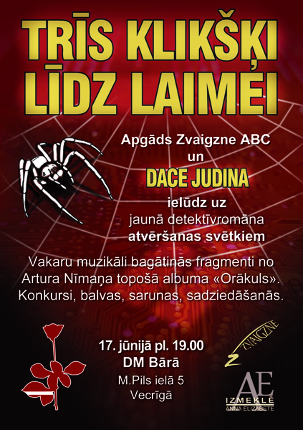 Dace Judina savos detektīvromānos šķetina noziegumus, kas notiek tepat Latvijā mūsu dienās, un daudzas situācijas šķiet kā no reālās dzīves ņemtas. Te ir gan pērkami politiķi un izvirtuši modes biznesa darbinieki, gan noslēpumaini pusaudžu rituāli un pazuduši cilvēki, melīgi pedagogi, vienaldzīgi vecāki, bet pāri visam – sazvērestības un noziegumi, kas aizsākas virtuālajā vidē. Pateicoties Daces Judinas izcilajām novērošanas spējām un veiklajam stāstījumam, “Trīs klikšķi līdz laimei” vienlaikus ir aizraujošs detektīvs, skarba valstī notiekošo sociālpolitisko procesu analīze un atgādinājums ikvienam: mēs paši esam mūsu valsts, un mūsu nākotne būs tāda, kādus mēs izaudzināsim savus bērnus. Kā grāmatas priekšvārdā raksta autore: “Nekas nav tik vienkārši, kā izskatās. Mēs visi esam tīklā. Vairākos vienlaicīgi, un jebkas, ko darām, sakām, rakstām vai pat tikai nodomājam, sakustina smalkos tīmeklīšus, nosūtot ziņu pārējiem. Bet kas atrodas centrā? Lielais, melnais plēsoņa vai rasas lāse, kurā spoži uzmirdz pirmais rīta saules stars?”